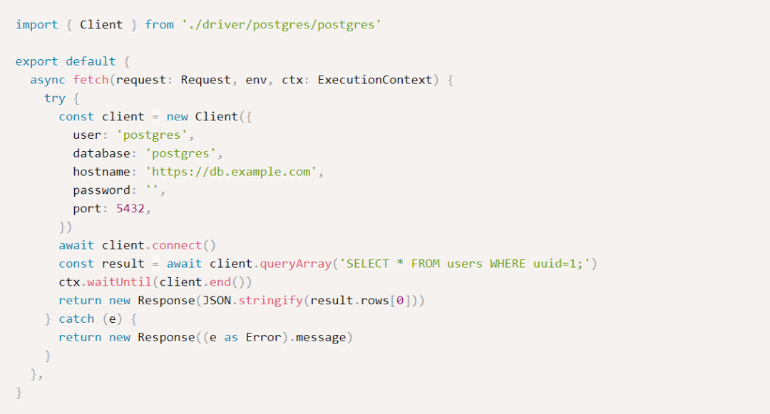 其次,只是建立联系是远远不够的。为了方便提交查询和管理响应,开发人员使用数据库的客户端库。由于 Workers 运行时并非完全兼容 Node.js,因此我们要么推出自己的数据库库,要么找到一个不使用不受支持内建库的数据库。