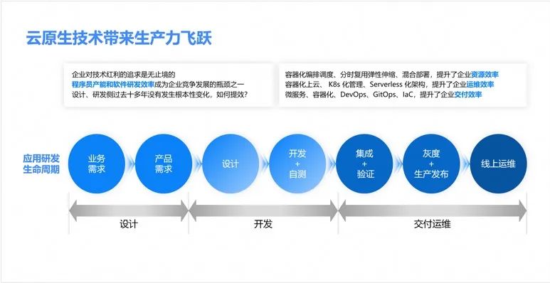 在软件研发的生命周期中,设计、开发、交付和运维都是不可或缺的环节。云原生技术的出现带来了显著的效率提升和成本降低。云原生技术的发展堪称一次生产力的飞跃,它在多方面带来了显著的提高。例如,容器化的编排调度、分时复用、弹性伸缩和混合部署大幅提升了企业的资源效率,使得许多企业的资源利用率从 10% 提升至 40% 以上,显著降低了成本。同时,容器化上云、K8s 化管理以及 Serverless 架构等技术的出现,从过去需要自行维护大量组件到如今的免运维、弹性全托管,大幅提升了运维效率。微服务、容器化、DevOps、GitOps、IaC 等技术,提升了企业软件的交付效率,让业务敏捷迭代。