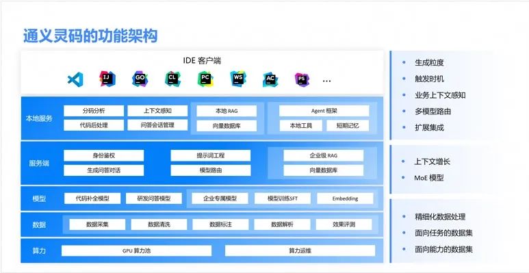 上图展示了通义灵码的功能架构。核心组件包括数据处理、专用模型、服务端和本地服务等。语料数据是整个系统的核心支撑,我们在数据采集、数据清洗、标注、解析和效果评测比对上下足功夫,确保数据的高质量和多样性。我们采用了混合专家模型思路,以应对不同使用场景对内容和响应时间的不同需求。具体使用的模型包括:代码补全模型帮助程序员高效补全代码;研发问答模型回答与编程相关的各种问题等。每种模型针对特定任务优化,以提供最佳的用户体验。