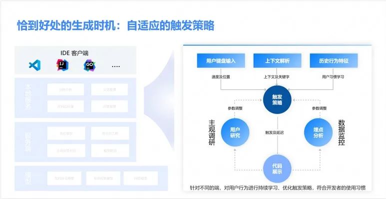为了确保程序员在工作中不被打断,我们对用户的键盘输入、上下文解析和历史行为特征进行了深入学习,包括主观调研、埋点监控分析,以及针对不同平台的用户行为持续优化触发策略,使其更符合开发者的使用习惯。
