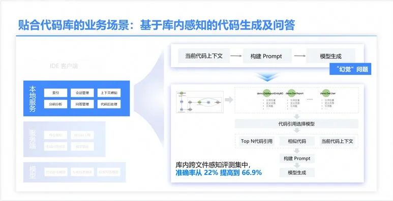 此外,我们设计了贴合代码库的业务场景,基于库内感知进行代码生成和问答。通过实时代码语义分析、引用链路追踪和动态类型推导,全面获取语义信息,避免只关注当前文件带来的幻觉问题,从而增强模型回答的准确性,库内跨文件感知评测集准确率因此从 22% 提升到 66.9%。