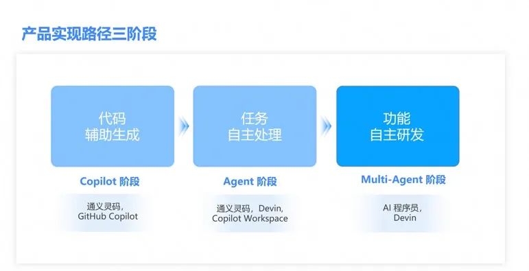第一个阶段是代码辅助生成 Copilot:初始阶段我们在 IDE 内提供基础的代码辅助功能,目前通义灵码处于这一阶段,并完成了产品的研发和行业推广。 第二个阶段是任务自主处理的 Agent 智能体:用来进一步提升程序员的开发效率,目标是帮助开发者提升 100% 的编程效率,帮助企业提升研发效能达 50%,这一步产品能力也基本完成。 为了实现更高的生产力突破,我们正在探索第三阶段,即跳出 IDE,基于 Multi-Agent(多智能体)实现自主研发,即 AI 程序员。阿里云也发布了首个 AI 程序员 Demo,它是基于通义大模型构建的多智能体,每个智能体分别负责具体的软件开发任务,并互相协作,可以端到端实现一个产品功能的研发,大幅简化软件开发流程。例如,在编码智能体中,AI 程序员首创了代码仓库知识图结构,不仅能理解用户的需求,还能精准定位代码对应的修改位置并自动给出修改方案。