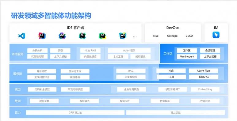 我们对于多智能体产品的定位,是希望为企业培养更多的 AI 程序员,未来的工作模式希望人类程序员 965,AI 程序员 007,这是我们构建这个产品所期待实现的目标。从功能架构演进的角度来看,底层依托于通义灵码产品中积累的能力,将其迁移出 IDE 并走向多智能体架构,需要在各个层面强化产品体系。在端侧,我们不仅需要覆盖更多的 IDE,还要跳出 IDE,融入整个工作空间,延伸至 DevOps 流水线和工具平台,因为企业各工种的研发协作都在软件开发流水线上进行,我们必须将这些能力迁移到企业的研发流水线中。在本地服务方面,我们还需要实现多智能体管理、长会话管理和上下文管理。