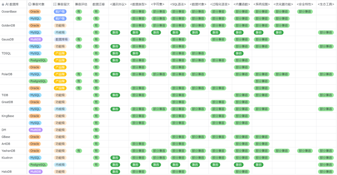 在去年曾写过一篇数据库兼容性的文章《Oracle 兼容性面面观》,得到的很多读者的关注。近期又接触到部分兼容性工作,特收集整理了部分国产数据库的兼容情况,整体感觉国内产品这部分做的差异还是蛮大的。本文将从一张对比表入手,谈谈国内产品的兼容性问题,并简单介绍下各家的兼容性情况。