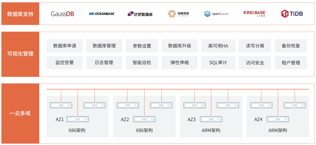 提供统一的管控平台,支持数据库全生命周期的自动化、智能化管理和维护,拥有日志管理、智能巡检、服务编排、弹性伸缩对等诸多实用功能,可对所有数据库实例进行管理,大幅提升管理效率,降低风险。