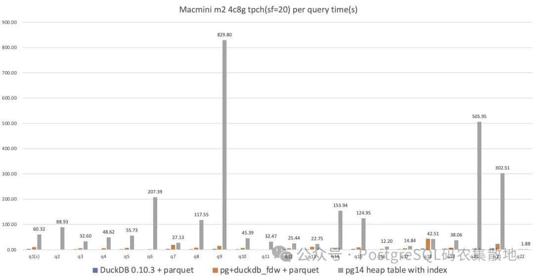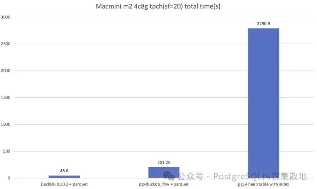 PG被DuckDB碾压,还不反省? DuckDB v0.10.3 在Macmini 2023款上的tpch性能表现如何? PostgreSQL使用duckdb_fdw 的tpch加速性能表现如何?PG本地表的表现如何?