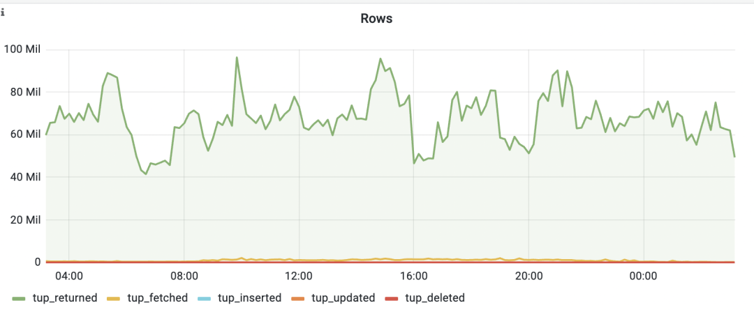 从监控数据来看,数据库每秒进行的全表扫描操作涉及近一亿行记录,而每秒的数据插入和更新操作约3000行。这反映出该系统在日常运营中承受着相对较高的业务负荷。