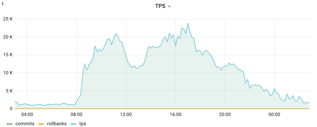 主数据库的流量:下图展示了主数据库每日的在线交易流量情况。在日常业务高峰时段,主数据库需要承受每秒超过2万次的事务提交压力,突显出作为在线交易核心的TP数据库对及时处理能力和高效运作的严格需求。