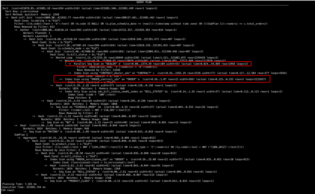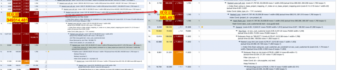 分析发现,因为nestloop导致这个节点的执行时间为 189.326ms * 1765 = 334149.8 ms 占据了98%的执行时间。进一步观察发现,这一个节点的行数估计值与实际值相差较大,怀疑是统计信息过期,导致代价不准;