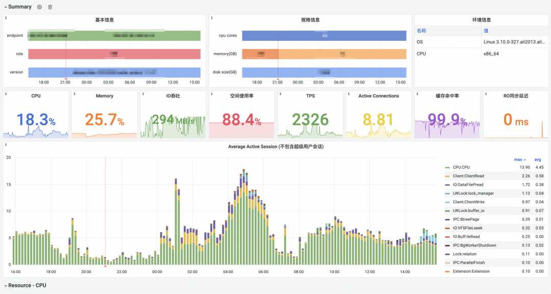 SQL执行时间变为 629.975 ms,降低了3个数量级。PolarDB-PG还支持使用全局自动负载信息库(Global Automatic Workload Repository,简称GAWR)对数据库进行全方位多维度的监控。如下图所示,监控指标涵盖CPU、内存、I/O、文件系统、TPS、连接数、缓存命中率、延迟、慢SQL等多个维度,基于这些指标可以对数据库系统问题进行详细分析。了解更多 🔗 https://help.aliyun.com/zh/polardb/polardb-for-postgresql/overview-65