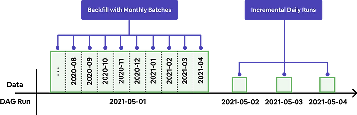 另一个极端,使用像一天这样的小窗口回填太慢。为了提高可扩展性、减少运行时间和提高恢复能力,Airbnb实施了批量回填。