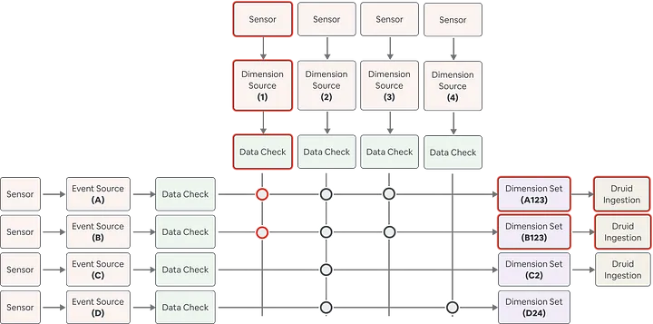 上图中我们可以看到,维度源1中的某个维度已更新。鉴于这个维度被两个维度集(即A123和B123)使用,与这两个维度集相关联的数据版本也会相应更新。随着数据版本的更新,这两个维度集的将启动自动回填。在Minerva中,变更产生新的数据版本,进而触发回填,Minerva维持跨数据集数据一致性的方法,确保上游变更有效、可控的传播到所有下游数据集。