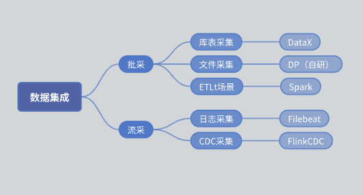 批采:分为库表采集和文件采集。 库表采集:主要使用DataX实现。 文件采集:自研的DP引擎。 ETLt采集:自研的ETLt采集引擎。DataX偏向于ELT(抽取、加载、转换),适用于数据抽取入库后再进行复杂的转换,但在某些场景下需要进行EL小T(抽取、加载、简单的转换),DataX并不适合。因此,我们基于Spark SQL自研了一个引擎。 流采:日志采集主要基于Filebeat,CDC采集主要基于Flink CDC。