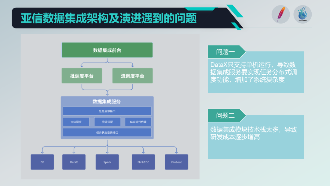 我们集成了一些开源项目,如DataX、Spark、Flink CDC、Filebeat等,形成了一个功能强大的数据集成服务平台。但也面临一些问题:
