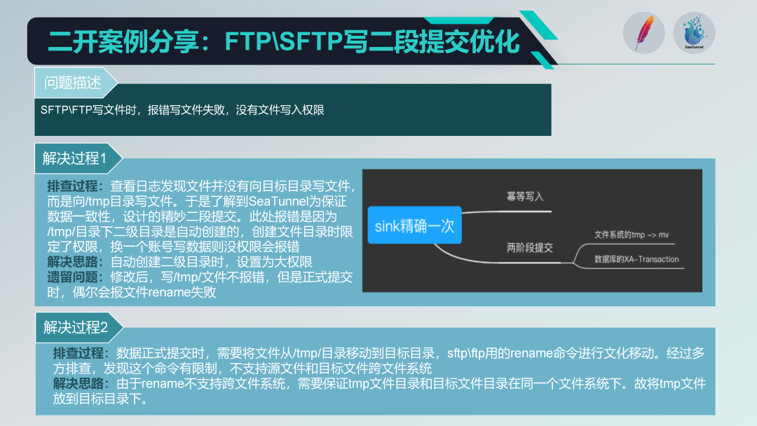 问题描述:在使用 FTP 和 SFTP 进行文件写入时,报错提示没有写入权限。排查发现,SeaTunnel 为了保证数据一致性,会先将文件写入临时目录,然后再进行移动。