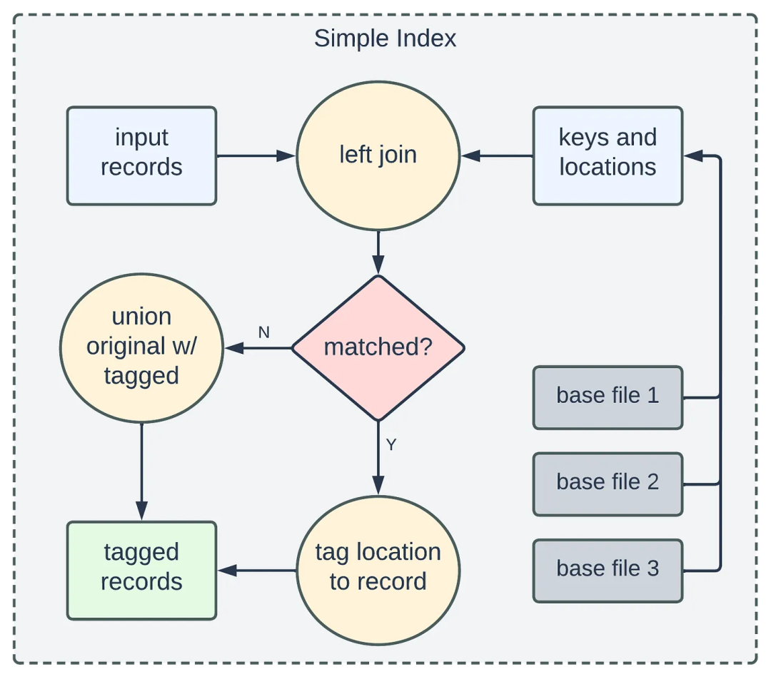 简单索引是非全局索引,目前用作默认类型。它背后的主要概念涉及扫描相关分区中的所有基本文件,以确定传入的记录是否与任何提取的键匹配。