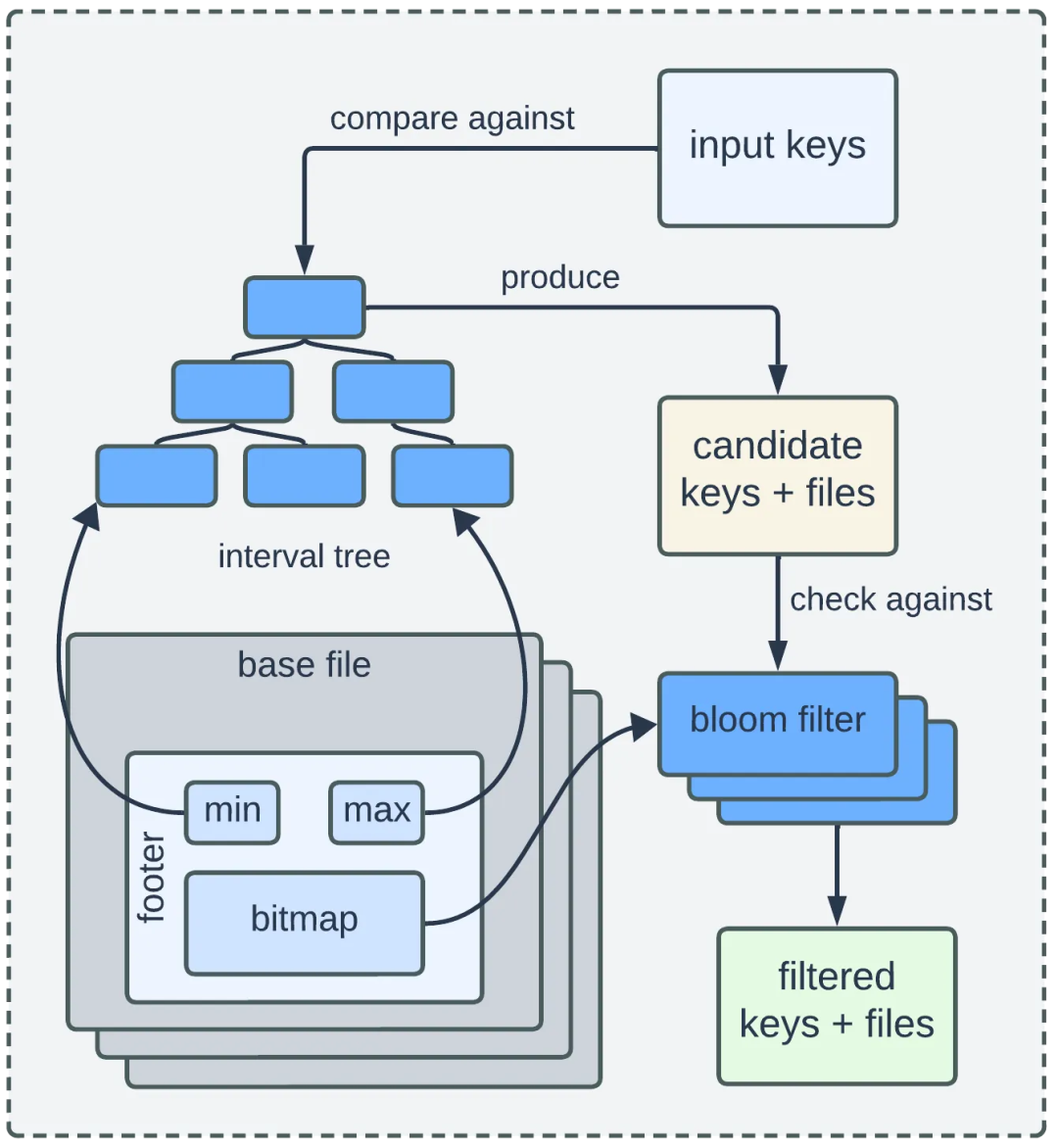 • 第二阶段根据反序列化的 Bloom 过滤器检查候选键,这有助于确定明确不存在的键和可能存在的键。然后使用筛选后的键和关联的基文件执行实际的文件查找,这些基文件随后返回用于标记的键和位置元组。