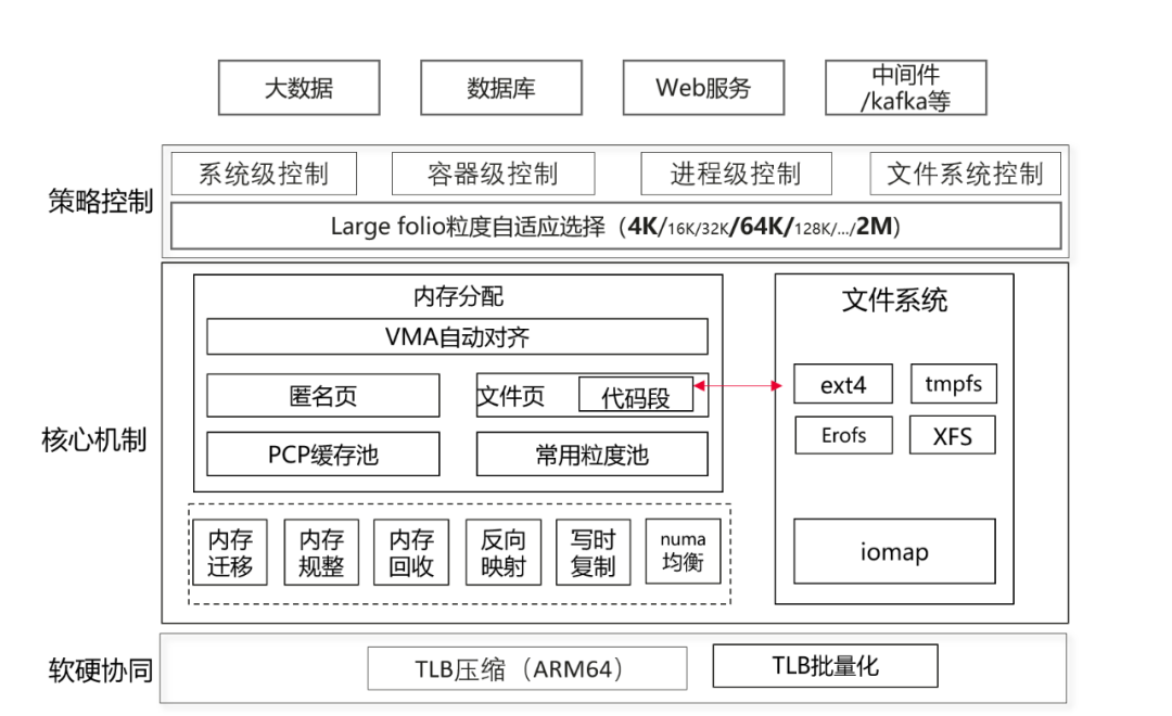 软硬协同优化:伙伴系统、大页、透明大页的large folio优化,支持大页拆分到任意order,内存聚合拆分、内存释放时批量化刷新TLB,避免频繁刷新TLB带来的性能开销。针对ARM64支持基于contiguous bit技术的大页,如64K“大页”,充分利用硬件TLB“压缩”机制降低TLB miss,提升程序性能。