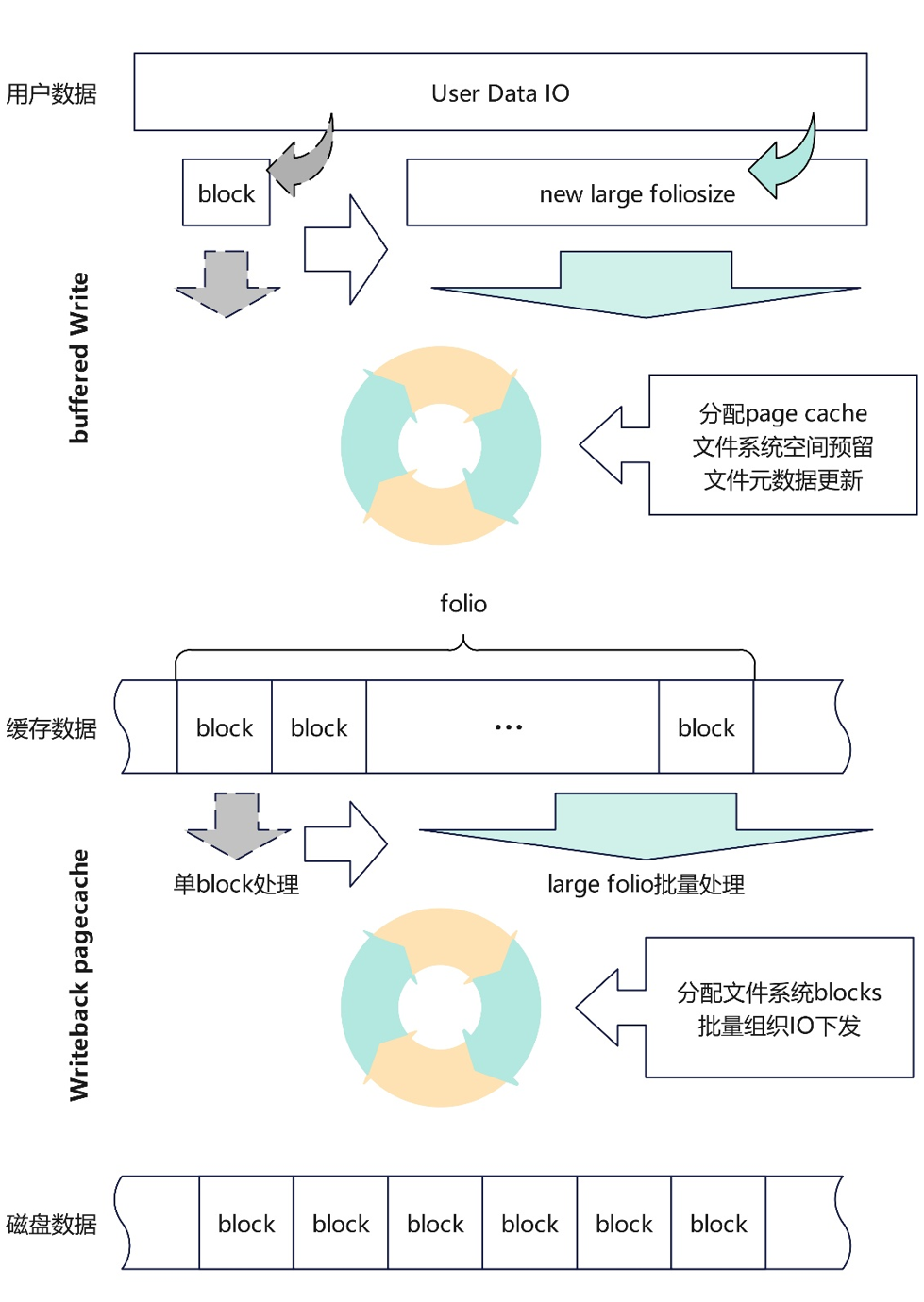 ext4切换至iomap框架,并实现ext4支持large folio,提升读写性能:ext4文件系统buffered io读写流程以及pagecache回写流程弃用老旧的buffer head框架,切换到iomap框架可使extent分配按照用户下发IO大小迭代,预读和回写IO组装按large folio大小迭代,同时弃用jbd2 data=ordered的日志模式,文件数据无需依赖日志回写进程下发,大幅提升大IO读写性能。