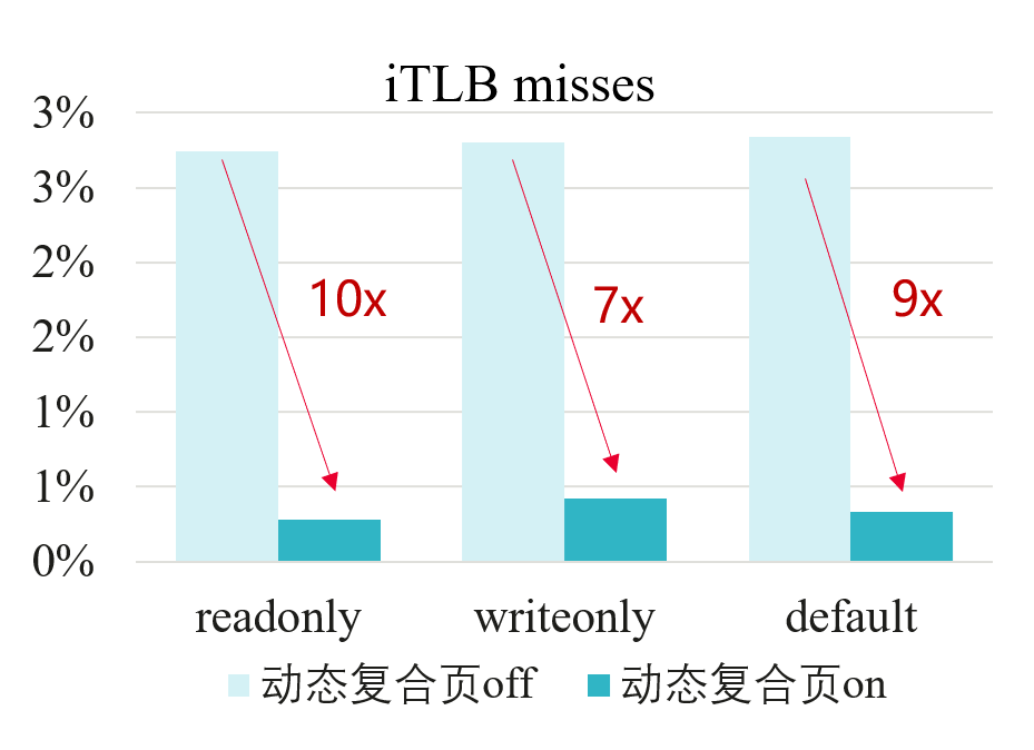 打开动态复合页后,测试MySQL benchmark(sysbench),受益于代码段可以用户态无感得合成2M大页从而使iTLB miss率最高降低10倍,sysbench整体结果性能提升3%+