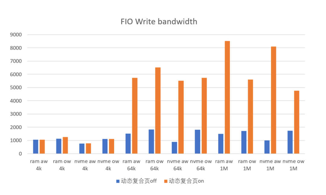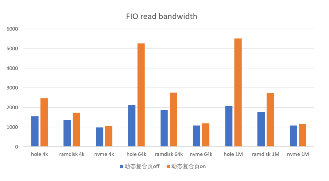 打开动态复合页后,测试FIO读性能平均提升59%,写性能平均提升239%