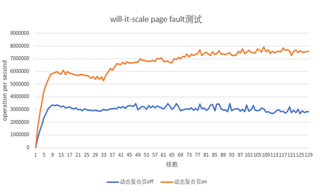 打开动态复合页后,测试linux社区常用的benchmark工具will-it-scale测试内存分配性能,受益于单次pagefault可批量分配large folio从而减少page fault次数,以及PCP缓存池的分配加速,匿名页和共享文件页的page fault ops平均提升100%