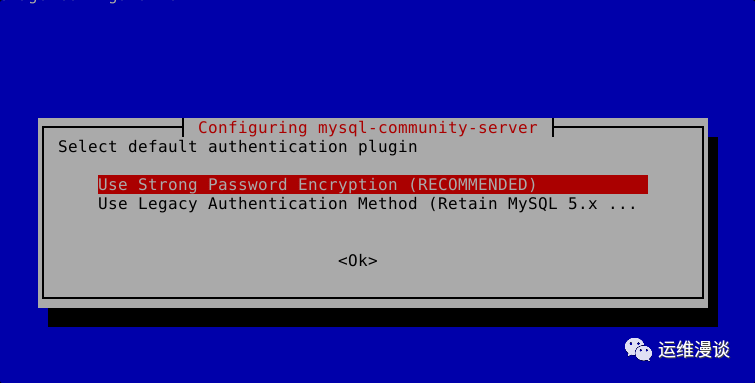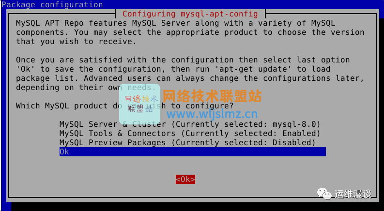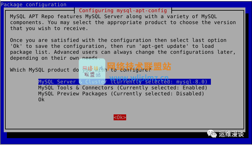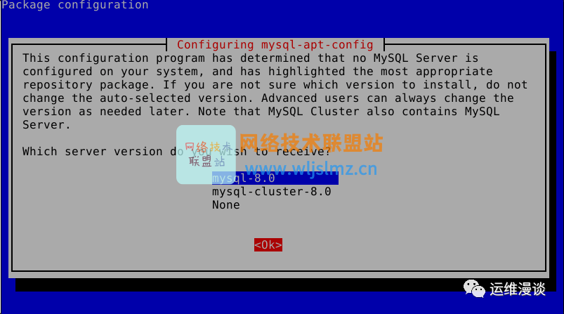 选择 MySQL 服务器的可用版本,在我们的例子中是 myslq-8.0。之后使用TAB选择OK并按Enter键。