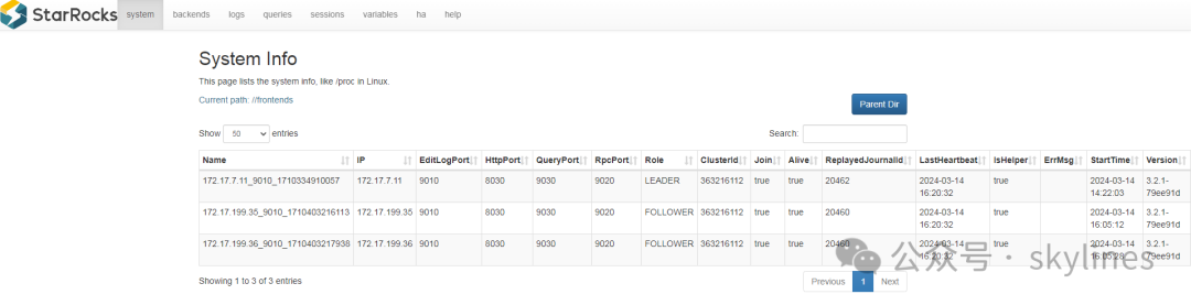 ##登录http://leader_IP:8030/system?path=//frontends各节点fe配置信息和状态