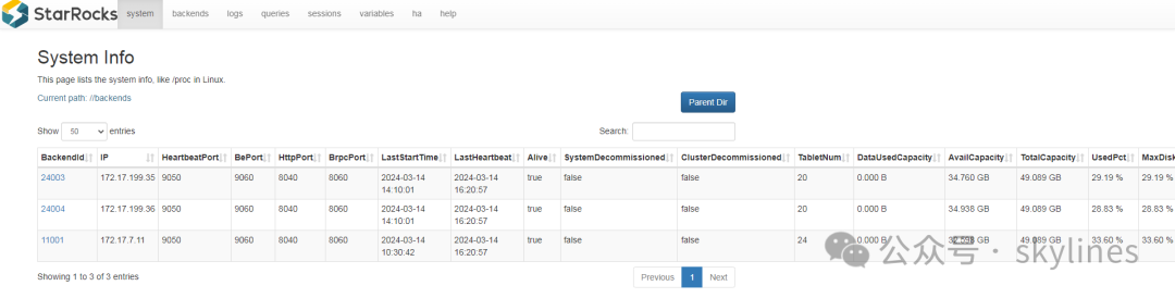 配置好starrocks高可用集群后还可以通过web前端查看fe和be的信息和状态,如下截图所示: