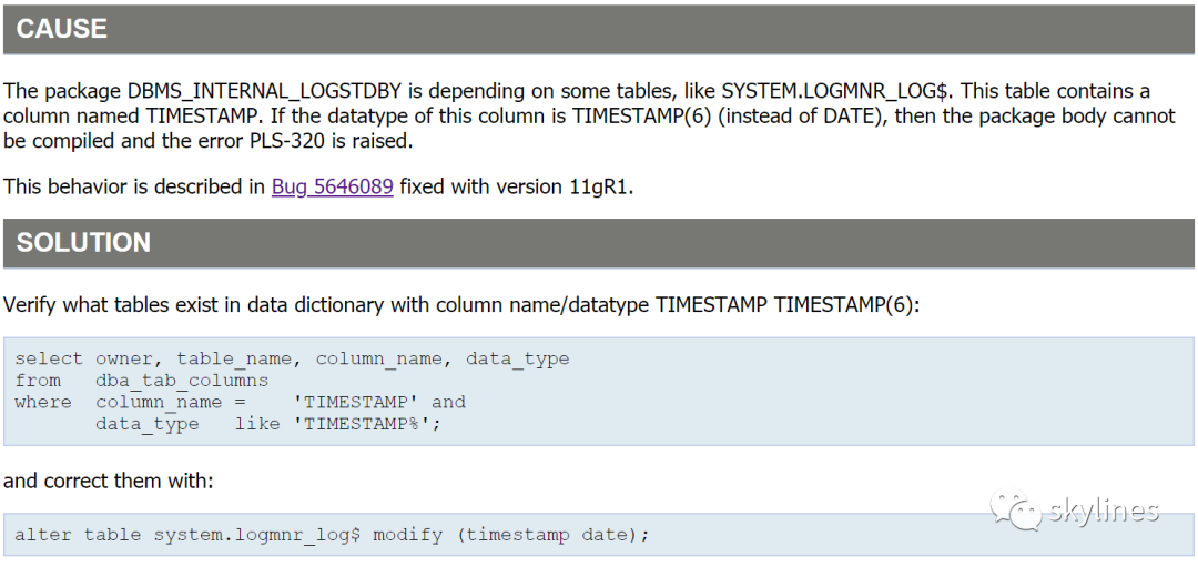 06:01:17 sys@MYSOURCE > select * from dba_errors where name = 'DBMS_INTERNAL_LOGSTDBY';OWNER NAME TYPE SEQUENCE LINE POSITION TEXT ATTRIBUTE MESSAGE_NUMBER---------- ---------------------- ------------------------------ -------------------- -------------------- -------------------- -------------------------------------------------------------------------------- --------- --------------SYS DBMS_INTERNAL_LOGSTDBY PACKAGE BODY 1 5955 8 PL/SQL: ORA-00942: table or view does not exist ERROR 0SYS DBMS_INTERNAL_LOGSTDBY PACKAGE BODY 2 5954 3 PL/SQL: SQL Statement ignored ERROR 0Elapsed: 00:00:00.0106:01:18 sys@MYSOURCE >06:01:19 sys@MYSOURCE > select owner, table_name, column_name, data_type06:02:07 2 from dba_tab_columns06:02:07 3 where column_name = 'TIMESTAMP' and06:02:07 4 data_type like 'TIMESTAMP%';OWNER TABLE_NAME COLUMN_NAM DATA_TYPE---------- ----------------------------------- ---------- ---------------SYS REGISTRY$ERROR TIMESTAMP TIMESTAMP(6)06:02:10 sys@MYSOURCE > alter table sys.REGISTRY$ERROR modify (timestamp date);Table altered.06:02:10 sys@MYSOURCE > alter table system.logmnr_log$ modify (timestamp date);Table altered.