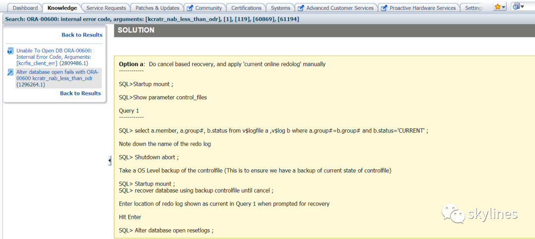 MOS地址:Alter database open fails with ORA-00600 kcratr_nab_less_than_odr (Doc ID 1296264.1)
