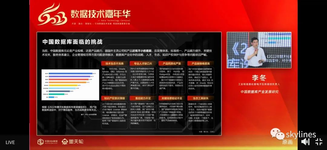 李冬先生总结到,中国数据库面临的问题和挑战有以下:技术生态不完整,专业人才缺口大,产品同质化严重,产品替换难度高,知识产权意识薄弱,售后能力不足、关键场景验证不足,生态工具缺失,共这八个方面。