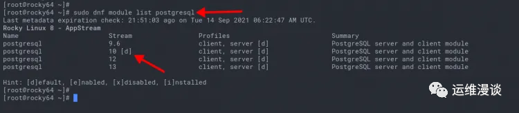 默认情况下,Rocky Linux 存储库提供多个版本的 PostgreSQL 包,即 PostgreSQL 10、12 和 13。
