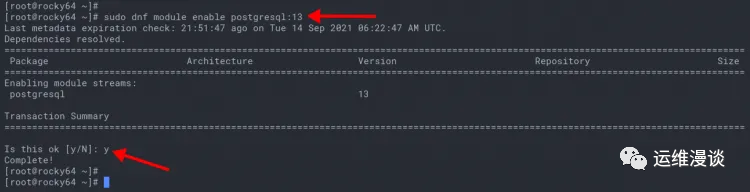 执行以下命令在 Rocky Linux 上检查 PostgreSQL 存储库。