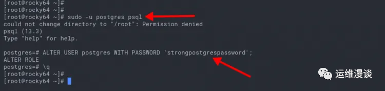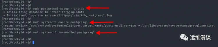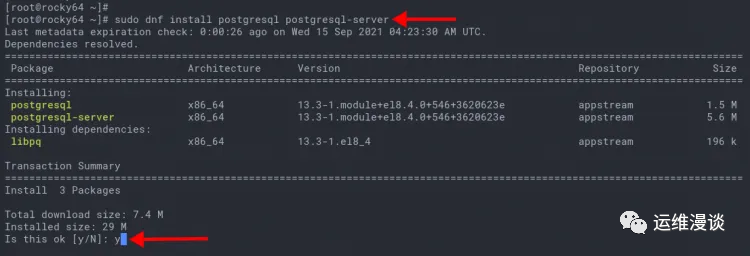 对于这一步,您将从官方 Rocky Linux 存储库安装 PostgreSQL 并在 PostgreSQL 上启用身份验证。