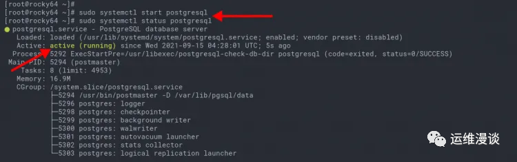 可以看出,启用了PostgreSQL服务,它会在系统启动时自动运行。它目前处于“活动(正在运行) ”状态。