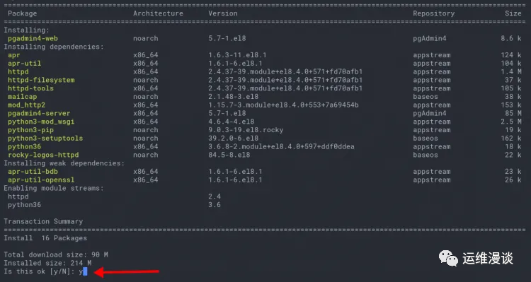 输入' y '并按' Enter '确认并添加pgAdmin4的GPG密钥。