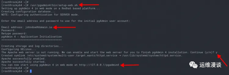 如果全部安装完成,执行下面的 pgAdmin4 设置脚本来创建一个新的管理员用户并为 pgAdmin4 设置 Apache/httpd 配置。