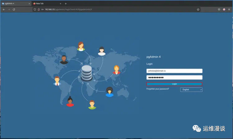 打开您的网络浏览器,输入您的服务器 IP 地址,URL 路径为“/pgadmin4”,如下所示。