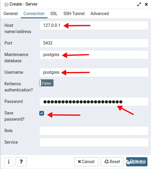 移至“连接”选项卡并键入您的详细信息 PostgreSQL 主机、数据库、用户和密码。
