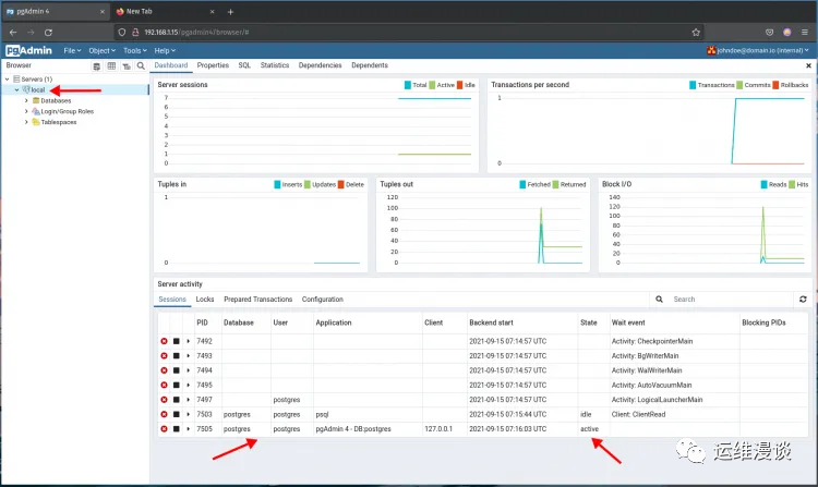 正如您在屏幕截图底部看到的,用户“ postgres ”使用应用程序“ pgAdmin4 ”连接到数据库“ postgres ”,并且连接状态为“ active ”。