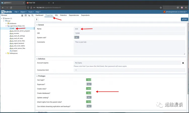 要验证您的新用户,请单击左侧的“登录/组角色”菜单,选择您刚刚创建的新用户“ bob ”。