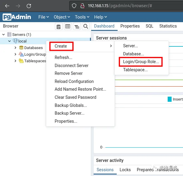 1.在连接名称菜单上右键单击“ local => Create => Login/Group Role..”。