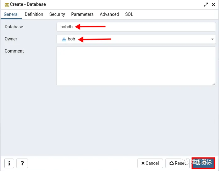 在“常规”选项卡上,键入您的新数据库名称并选择它的用户所有者。对于此示例,您将创建一个新数据库“ bobdb ”,并将用户“ bob ”设为所有者。