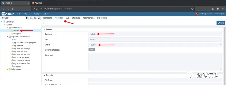 单击页面上的“属性”选项卡,您将获得数据库“ bobdb ”的详细信息,如顶部屏幕截图所示。