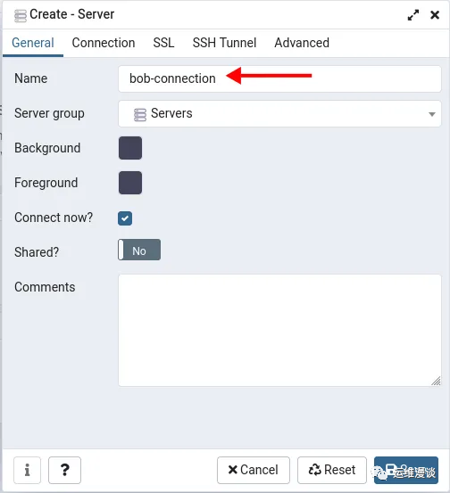 在选项卡“ General ”中,键入新的连接名称“ bob-connection ”,如下所示。