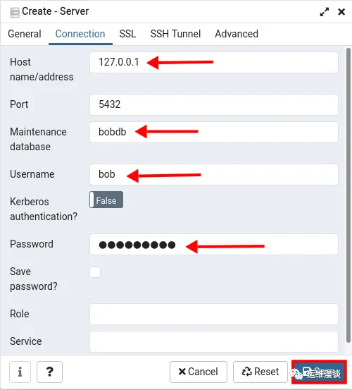 使用 pgAdmin4 验证 PostgreSQL 用户连接 在这个阶段,您将添加一个新的连接 pgAdmin 与用户“ bob ”和数据库“ bobdb ”