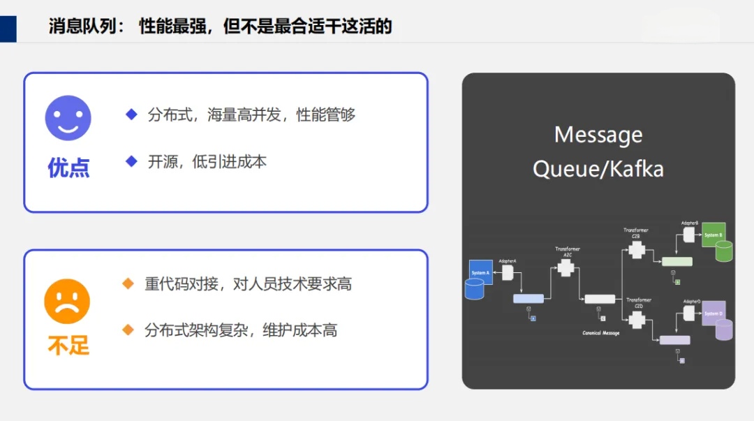 最近几年比较流行的是 Message Queue 方式, Kafka 是主流代表,特点是新一代的分布式架构,解决了性能问题。另一个非常重要的原因是开源,因为引入成本较低,在开始尝试时,不需要额外成本。弊端在于对代码对接要求比较高,架构维护成本高。