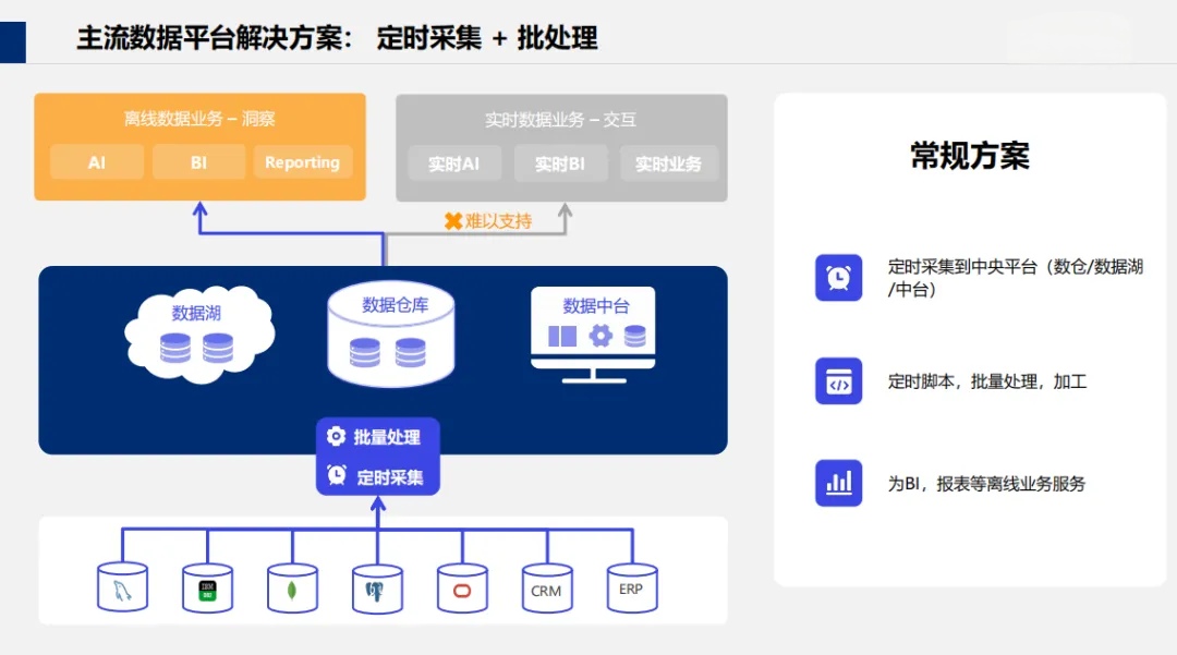 其中的核心点是把数据从各个源系统中采集过来,进行加工处理,形成模型。核心技术是定时采集和批量处理。数据中台为什么不能做到很好的业务支撑。一是组织架构的问题,二是技术工具的不匹配度。数据中台号称支撑业务,但它采用了市面上常规的批量业务或定时采集能力,导致数据并不新鲜,无法为实时要求较高的业务场景,比如实时BI、实时Dashboard,或是交互式、跟客户、状态、订单相关的场景就不能起到支持作用。