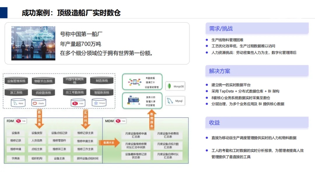 最后一个案例是搭建实时数仓。某造船厂是人力密集型的企业,有几万员工,造船工序繁琐,管理难度非常大,内部很多系统投入运行,但相对孤立,没法串通做整体效率的提升。